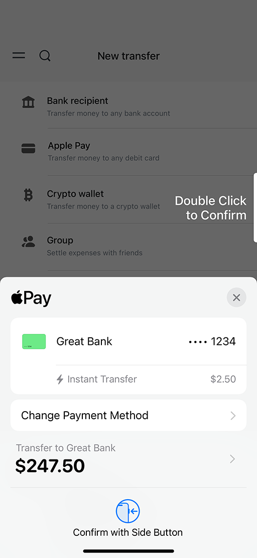 Let customers initiate a transfer of funds from an account to a card in Wallet. They can avoid manually entering card details by simply selecting the destination of funds directly on the payment sheet, with a concise view of any transfer fees set by the merchant.