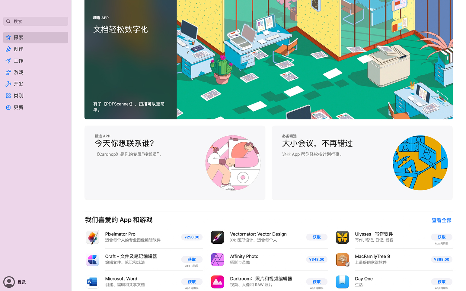 在“探索”中,客户能够找到 Mac App Store 上各款最新发布和更新的精彩 App。我们的编辑每周都会分享一些深度介绍、幕后花絮以及精选组合,以此推荐众多出色的 App 和游戏,并帮助用户利用 Mac 来做更多自己喜欢的事情。