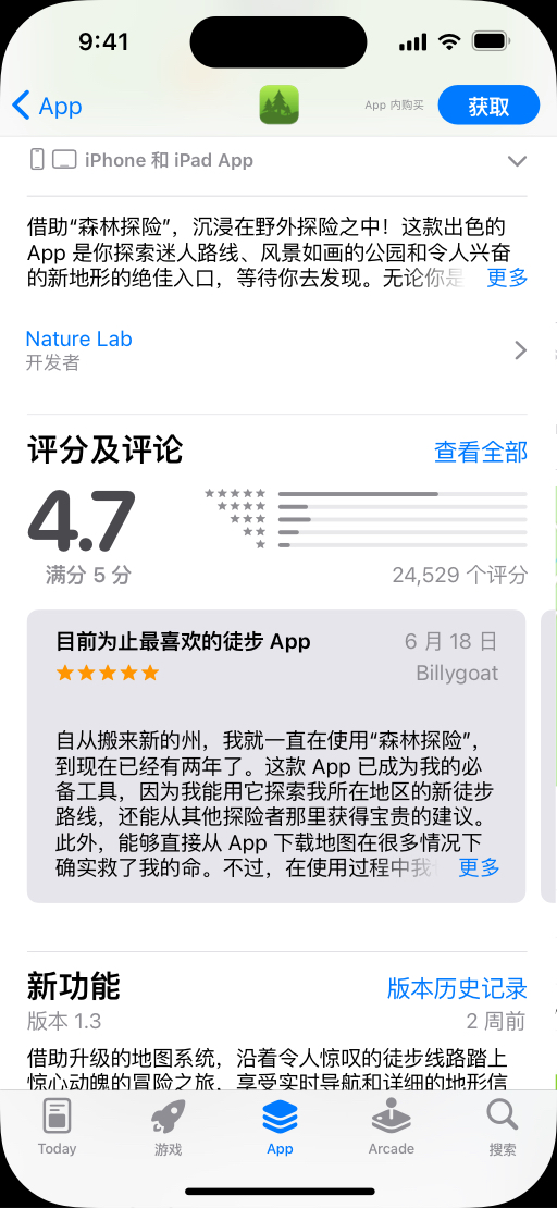当你更新 App 时,可使用“新功能”来告知用户有哪些变更内容。这一信息会在产品页面和 “更新” 标签的产品介绍中呈现。