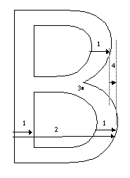 In the next several sections, these general ideas will be applied to the problem of instructing four characters using the TrueType language. The characters are from two different fonts: New York and Geneva. These are the TrueType renditions of the original Macintosh bitmap faces of the same name. They provide examples of instructing serif and sans serif faces.The four examples that follow will approach the task of instructing a glyph as a three step process:
