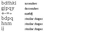 Problems of this sort are not simply of theoretical importance but can affect the legibility of digital typefaces. Common problems produced by uncontrolled rasterization include the uneven stem weights, dropouts,the loss of character features, and serif asymmetries. Some instrances of such problems are shown in Figure 2.
