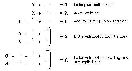 An accented formis a special subclass of ligature: a glyph that combines a letter with a diacritical mark. For example, the glyphs "ä" and "ò" are accented forms. Multiple accent marks themselves may be present in a font as accent ligatures, as shown in this figure: