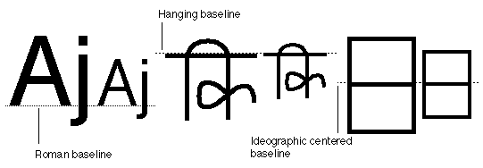 - This also defines behavior used in Chinese, Japanese, and Korean, but with the glyphs lowered slightly so that ideographs adjacent to Roman characters descend slightly below the Roman baseline.