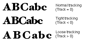 A track number is a value that specifies the relative tightness or looseness of the interglyph spacing. Positive track numbers result in an increase in the advance width of all glyphs in the font. Negative track numbers result in a decrease in the advance width of all glyphs. Increasing the advance width of glyphs increases the interglyph spacing to provide a relatively loose sequence of glyphs. Decreasing the advance width of glyphs decreases the interglyph spacing to provide a relatively tight sequence of glyphs. Normal tracking, tight tracking, and loose tracking are shown in the following figure: