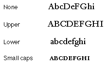 You can also use case substitution, which substitutes uppercase or lowercase noncontextual forms of the glyphs, even though that is not what the user originally chose. This is different from contextual forms because the positions of the glyphs and their meaning do not change. In the following figure, the same set of letters is shown four different ways: the first, with no case substitution; the second, with all the letters translated to their uppercase forms; the third, with all letters translated to their lowercase forms; and the fourth, with all lowercase letters translated to small caps.