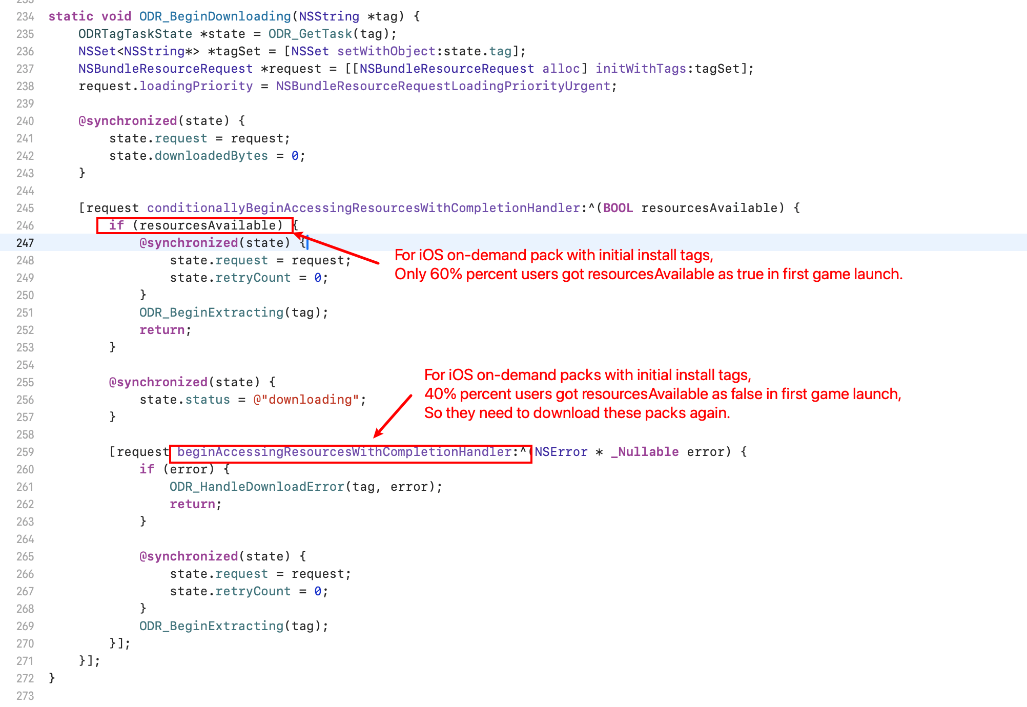 However, during actual use, we found that even when these packs are marked with the initial install tag, there is still a fairly high probability (around 40%) that they are not available on the first screen after the app is launched for the first time. When we try to access them through conditionallyBeginAccessingResourcesWithCompletionHandler, the resources are unavailable, which forces us to download them again.