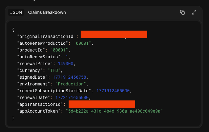The Anomaly (See Attached Screenshots): Upon decoding the JWSRenewalInfoDecodedPayload from the webhook, we noticed that the appAccountToken had unexpectedly changed to the new token (Token B).