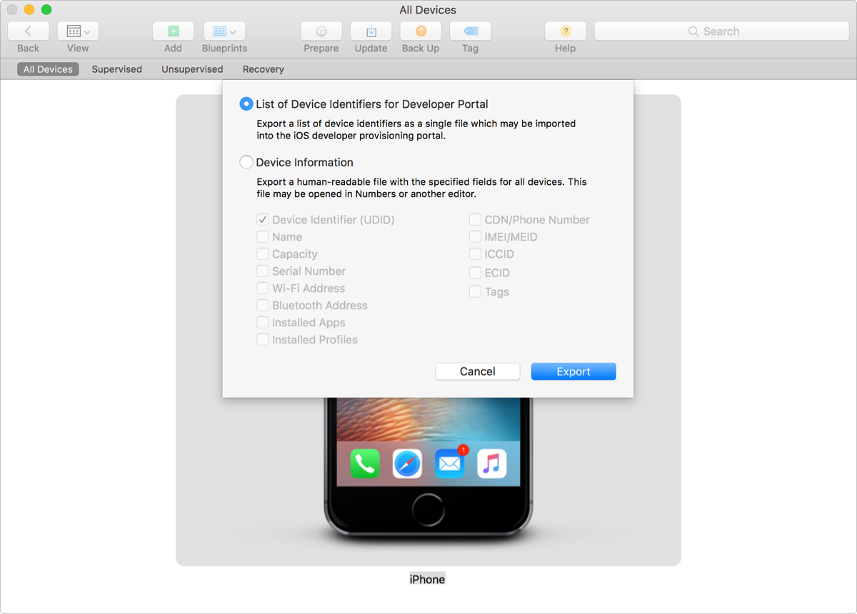 Select List of Device Identifiers for Developer Portal, then click Export.