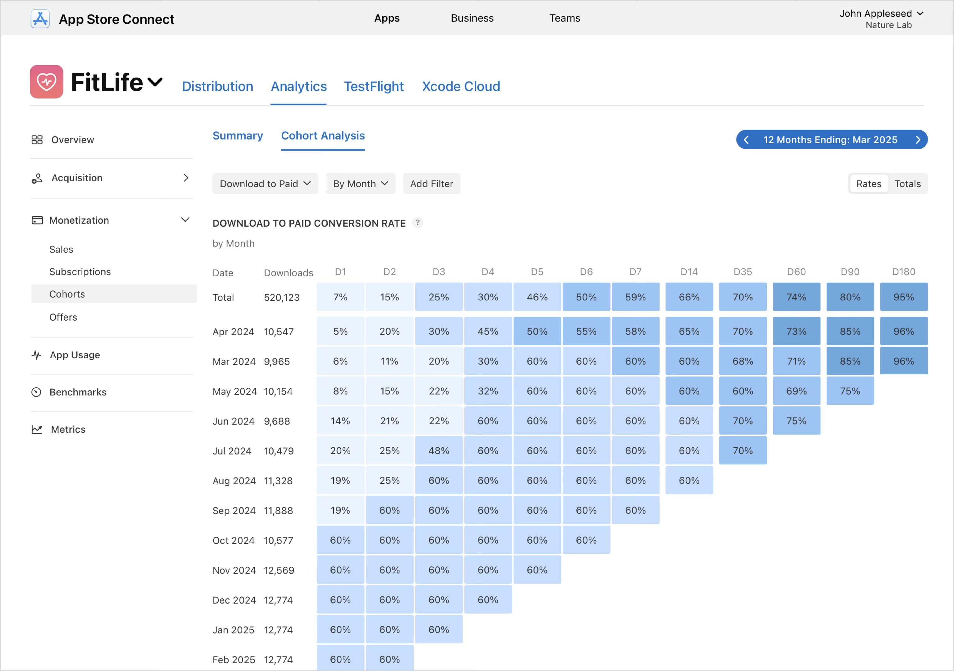 If you select the Download to Paid metric, each row represents a cohort of users who downloaded your app in the same month, and each column (D1, D2, D3, and so on) shows the percentage of that cohort that completed a paid transaction—such as starting a paid subscription or making an In-App Purchase—within a given number of days after download. This view helps you understand how effectively downloads convert into revenue over time, compare monetization performance across cohorts, and evaluate the impact of changes to onboarding, pricing, offers, or acquisition quality. Use filters like purchase type, subscription group, offer type, territory, or device to analyze specific segments, and switch between Ratesand Totals to view conversion performance as percentages or as absolute counts of paying users.