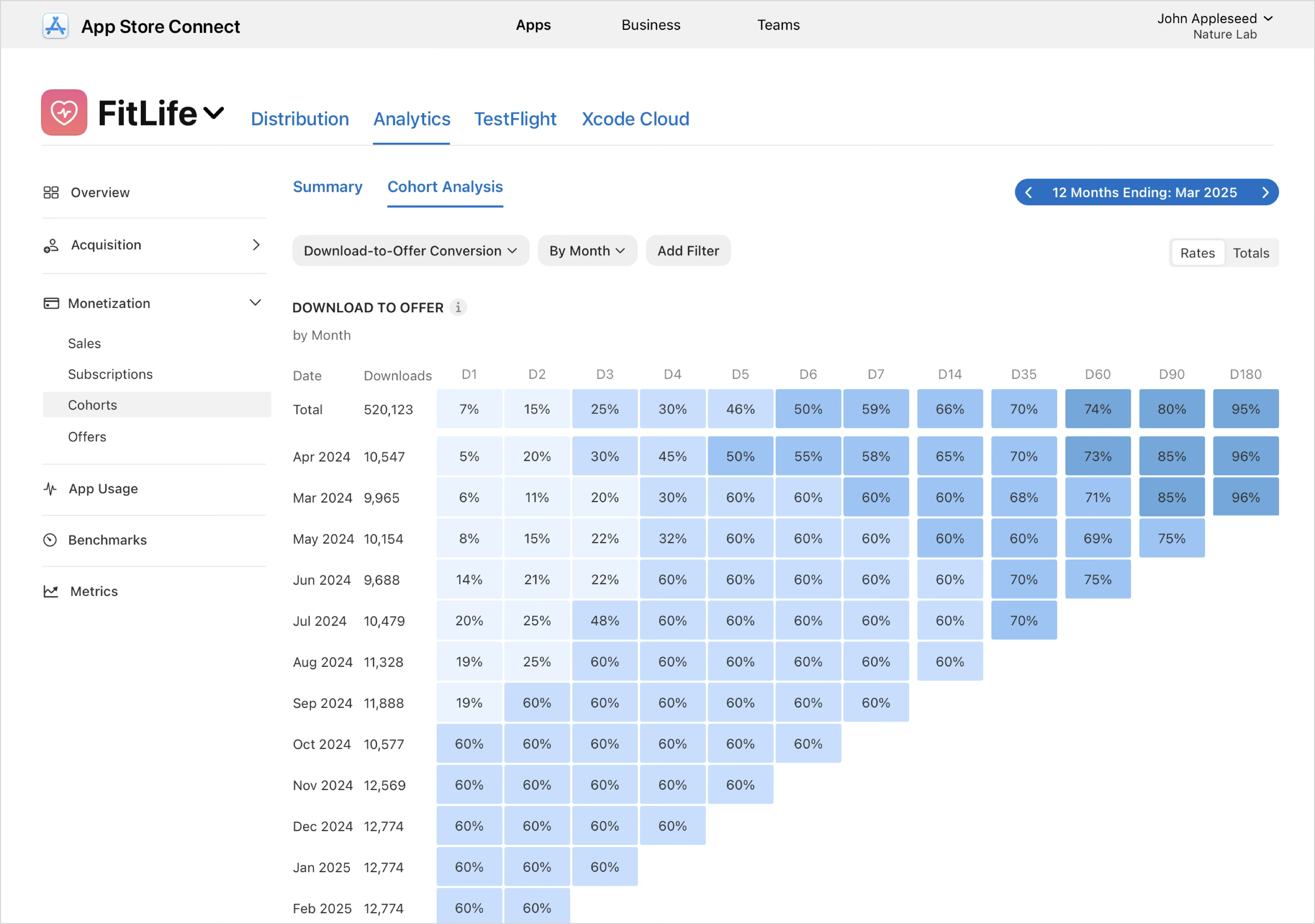 If you select the Download to Offer metric, then each row represents a cohort of users who downloaded your app in the same month, and each column (D1, D2, D3, and so on) shows the percentage of that cohort that activated an offer within a given number of days after download. This view helps you understand how quickly new users convert to offers, compare conversion speed and effectiveness across cohorts, and evaluate the impact of changes such as onboarding improvements, offer configuration, or acquisition quality. Use filters like subscription group, offer type, territory, or device to analyze specific segments, and switch between Rates and Totals to view conversion performance as percentages or absolute counts.