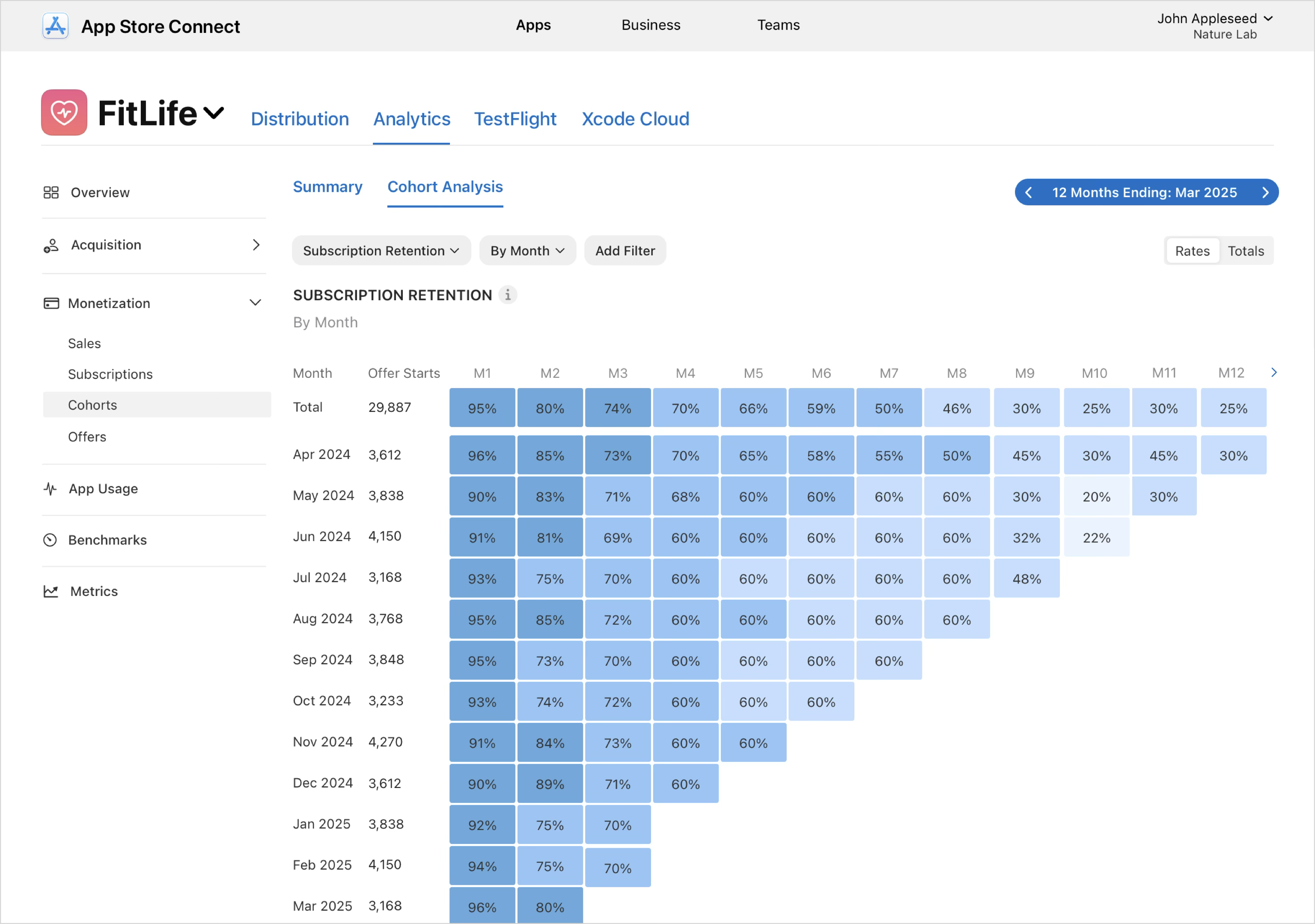If you select the subscription retention metric, then each row represents a cohort of subscriptions that started in the same month, and each column (M1, M2, M3, etc.) shows the percentage of that cohort that remains an active paid subscription after that many months. You can use this view to compare retention trends across cohorts, spot improvements or regressions over time, and understand how changes like new offers, pricing, or app updates affect long-term subscriber retention. Use filters such as subscription group, offer type, territory, or device to isolate specific segments, and switch between Rates and Totals to view retention as percentages or as absolute subscription counts.
