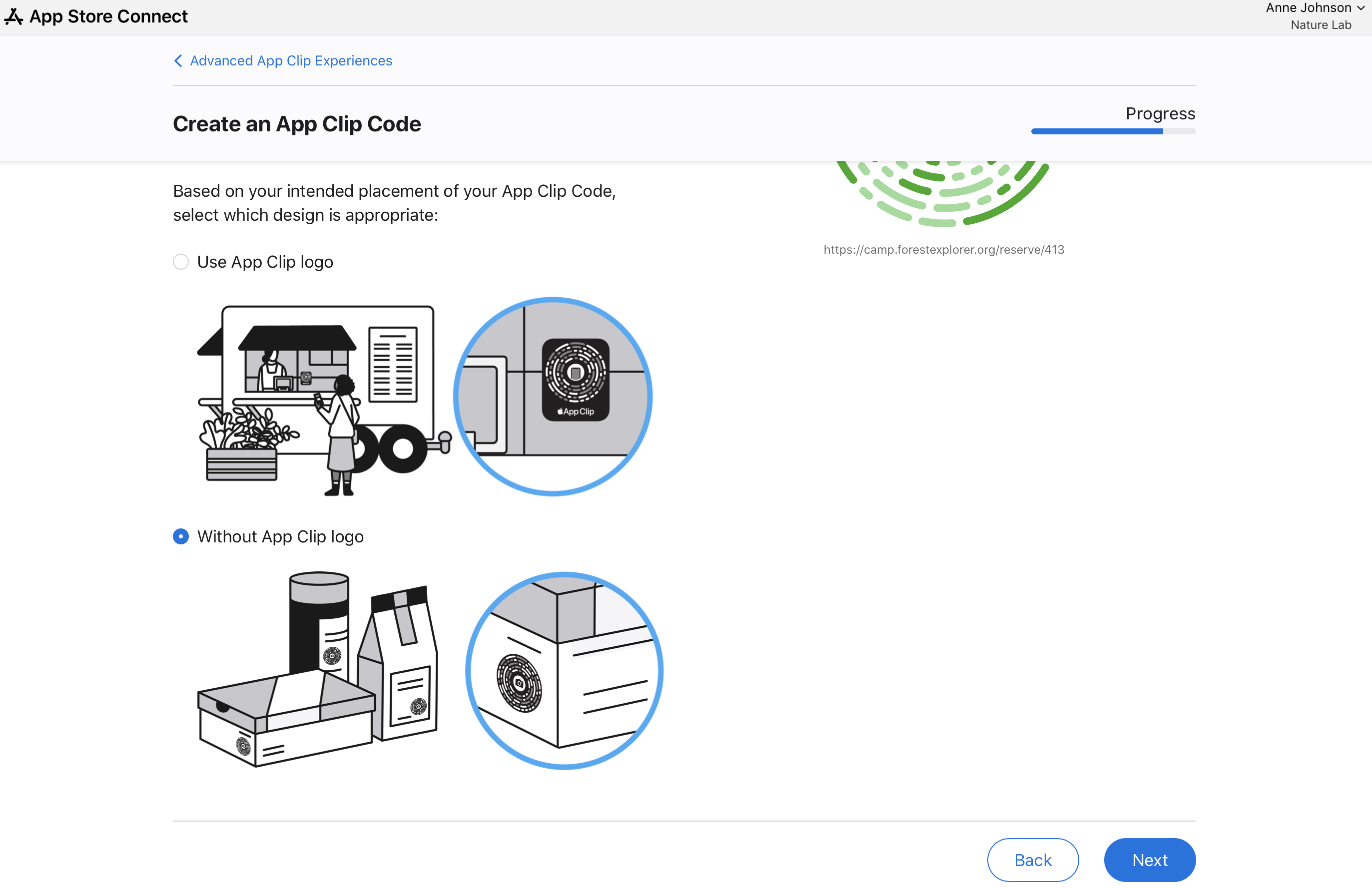 Based on the placement of your App Clip Code, select the appropriate design (“Use App Clip logo” or “Without App Clip logo”) and click Next.