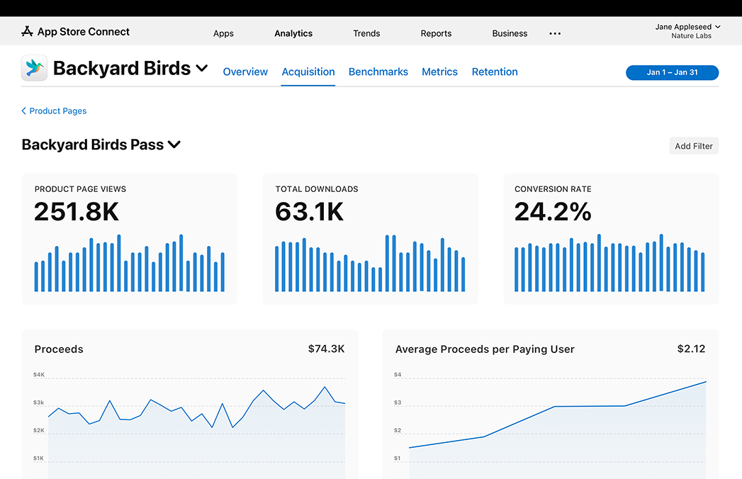 Measure your app’s performance and grow your business on the App Store with unique data insights that only Apple provides. Each month, Apple collects billions of data points to give you valuable information, including: