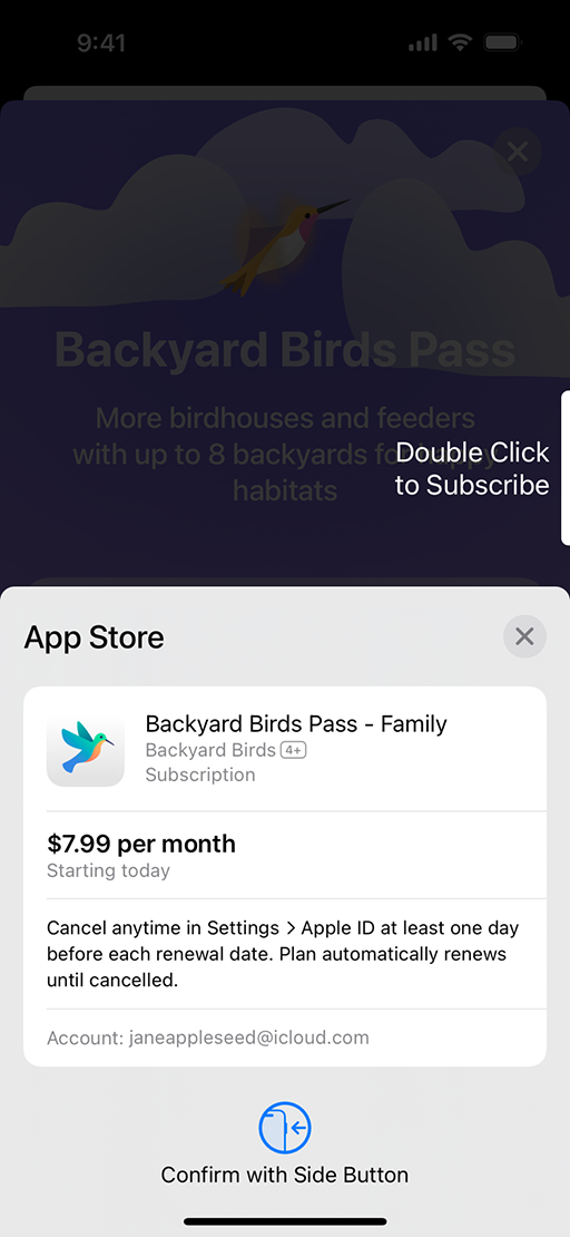 When a purchase is initiated, an App Store payment sheet displays relevant details that help customers easily understand the transaction (like the type of good or service, price, and subscription duration) before confirming their purchase.