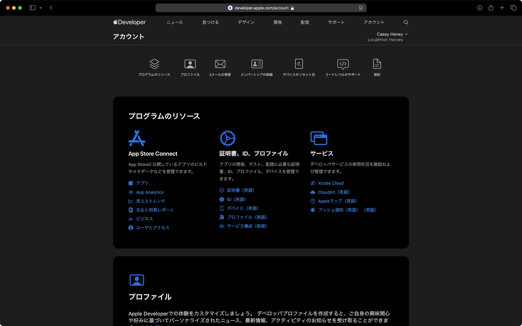 主要なデベロッパリソースにアクセスするには、Apple Developer WebサイトでApple Accountにサインインします。有料プログラム(Apple Developer ProgramまたはApple Developer Enterprise Program)に登録済みの場合は、登録時に使用したApple Accountをご使用ください。
