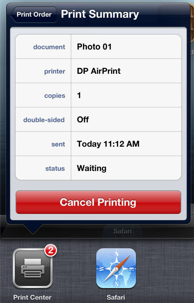Once a print job has been submitted and is either printing or waiting in the print queue, users can check on its status by double-tapping the Home button to access the Print Center in the multitasking UI. The Print Center (shown in Figure 5-4) is a background system app that shows the order of jobs in the print queue, including those that are currently printing. It is only available while a print job is in progress.