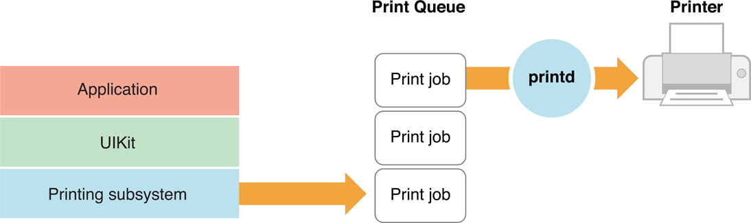 The printing system does a few things. As UIKit passes the print data to the printing subsystem, it writes this data to storage (that is, it spools the data). It also captures information about the print job. The printing system manages the combined print data and metadata for each print job in a first-in-first-out print queue. Multiple apps on a device can submit multiple print jobs to the printing subsystem, and all of these are placed in the print queue. Each device has one queue for all print jobs regardless of originating app or destination printer.