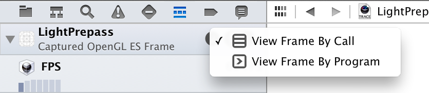 In the OpenGL ES frame debugger interface, the debug navigator is replaced by the OpenGL ES frame navigator. This navigator shows the OpenGL ES commands that render the captured frame, organized sequentially or according to their associated shader program. Use the Frame View Options popup menu at the top of the frame navigator to switch between view styles.