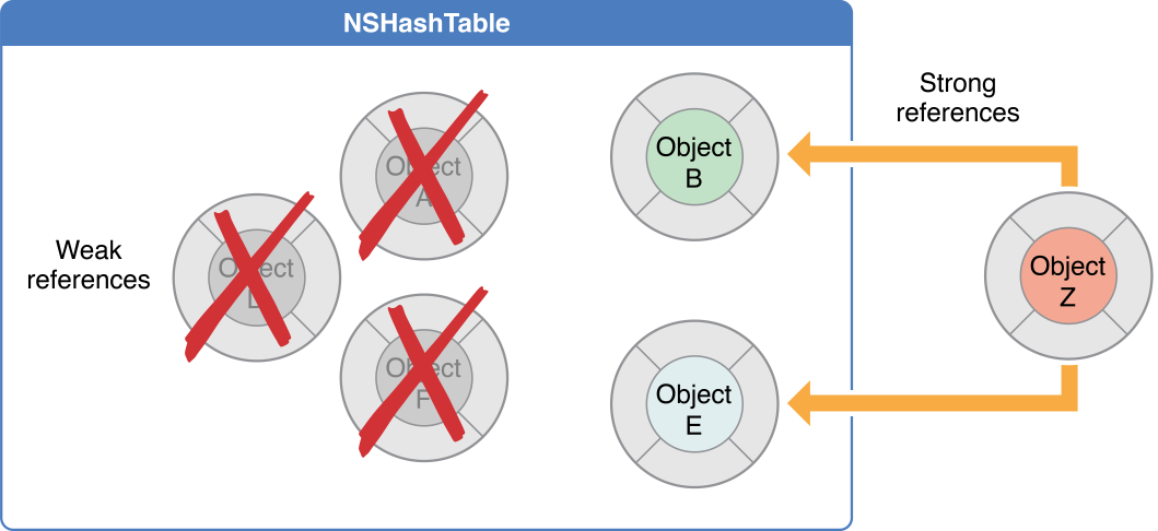 You can use an NSHashTable object when you want an unordered collection of elements that uses weak references. For example, suppose you have a global hash table that contains some objects. Because global objects are never collected, none of its contents can be deallocated unless they are held weakly. Hash tables configured to hold objects weakly do not own their contents. If there are no strong references to objects within such a hash table, those objects are deallocated. For example, the hash table in Figure 2 holds weak references to its contents. Objects A, C, and Z will be deallocated, but the rest of the objects remain.