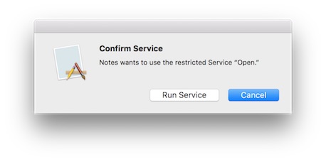 To avoid this problem, you mark a potentially dangerous service as restricted (as is the case for the Finder app’s Open service) by setting its NSRestricted property to YES. When a restricted service is invoked from a sandboxed app, the system warns the user and asks if the operation should proceed, as show in Figure 6. The service is still available, but only with explicit user consent.