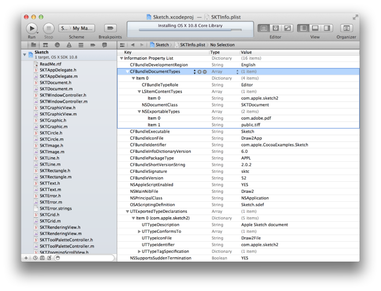 <appName>-Info.plistfile contains placeholder values for global app keys, as well as for theCFBundleDocumentTypeskey, whose associated value is a dictionary containing key-value pairs specifying information about the document types the app works with, including theNSDocumentsubclass for each document type.