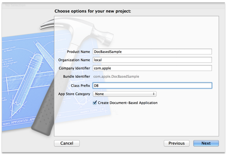 The following sections describe the process of selecting and utilizing the document-based app template.