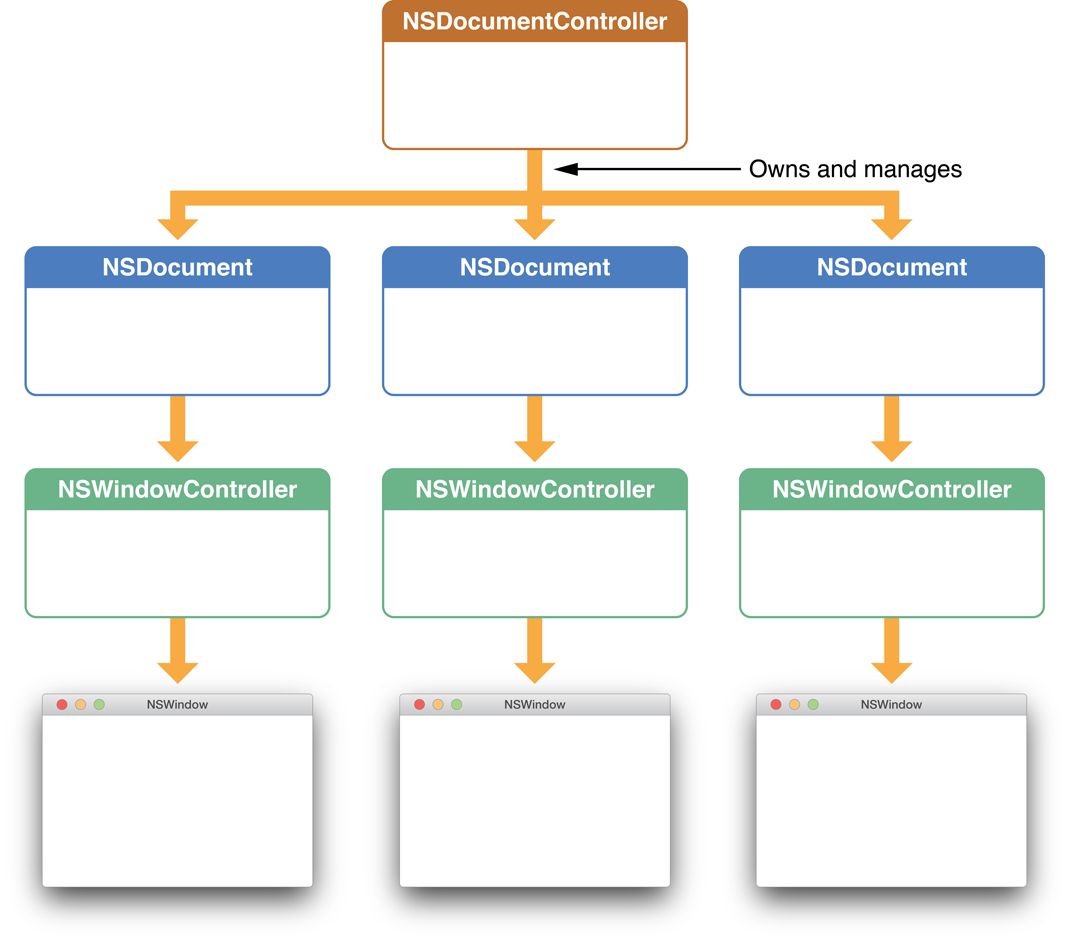 There are three major classes in the document architecture: NSDocumentController, NSDocument, and NSWindowController. Objects of these classes divide and orchestrate the work of creating, saving, opening, and managing the documents of an app. They are arranged in a tiered one-to-many relationship, as depicted in Figure 2-1. An app can have only one NSDocumentController object, which creates and manages one or more NSDocument objects (one for each New or Open operation). In turn, an NSDocument object creates and manages one or more NSWindowController objects, one for each of the windows displayed for a document. In addition, some of these objects have responsibilities analogous to NSApplication and NSWindow delegates, such as approving major events like closing and quitting.