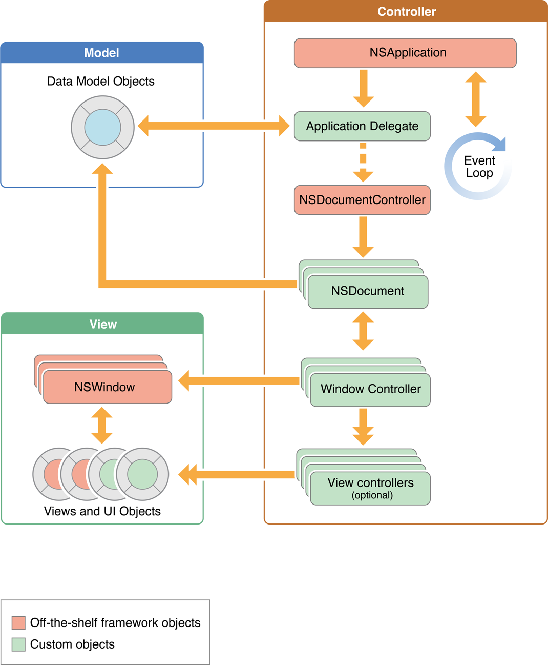NSDocument is the base class for document objects in the app architecture—you must create an NSDocument subclass for each type of document your app handles. When your app is running, it has an NSDocument-based object for each open document. In the MVC design pattern, NSDocument is a model controller because it manages the data model, that is, the persistent data associated with its document. An NSDocument object has the following responsibilities:
