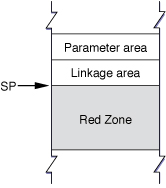 The calling routine’s stack frame includes a parameter area and some linkage information. The parameter area has the arguments the caller passes to the called subroutine or space for them, depending on the type of each parameter and the availability of registers (see Passing Arguments for details). Since the calling routine may call several subroutines, the parameter area must be large enough to accommodate the largest argument list of all the subroutines the caller calls. It is the calling routine’s responsibility to set up the parameter area before each function call. The called function is responsible for accessing the arguments placed in the parameter area.