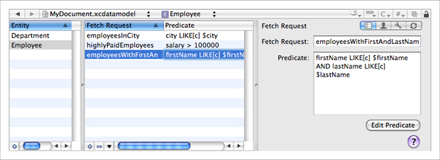 The fetch requests view displays the fetch requests associated with an entity as shown in Figure 8. You add fetch requests using the plus sign button. Although you can edit the name of the fetch request and the predicate directly in the table view, you typically construct the predicate graphically using the predicate builder from the detail pane. For more about fetch requests, see NSFetchRequest, and for details about the predicate syntax, see Predicate Format String Syntax in Predicate Programming Guide.