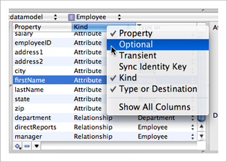 The table in the properties pane lists the properties or fetch requests associated with the selected entities. You choose what features you want to view by choosing from the command pop-down menu shown in Figure 5.