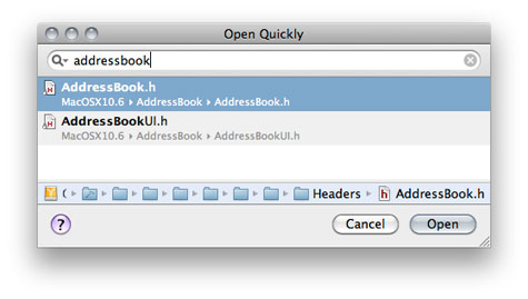 There may be times when you need to open a file whose location you don’t know or want to open the file that defines a particular symbol, such as a variable, method, or class. To assist you in those occasions, Xcode provides the Open Quickly command, which lets you open files by filename or by the symbols they define. Open Quickly searches are case insensitive and limited to the current project and the active SDK (see Building with Xcode for more information).