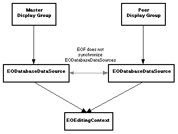 EODatabaseDataSources are usually used in a master-detail configuration where an EODatabaseDataSource acts as the master and an EODetailDataSource acts as the detail. However, you can also use two EODatabaseDataSources in a master-peer configuration where one acts as the master and the other acts as the detail (see Figure 1).