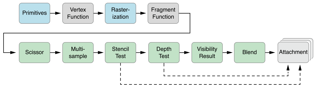 A MTLRenderPassDescriptor object represents the destination for the encoded rendering commands, which is a collection of attachments. The properties of a render pass descriptor may include an array of up to four attachments for color pixel data, one attachment for depth pixel data, and one attachment for stencil pixel data. The renderPassDescriptor convenience method creates a MTLRenderPassDescriptor object with color, depth, and stencil attachment properties with default attachment state. The visibilityResultBuffer property specifies a buffer where the device can update to indicate whether any samples pass the depth and stencil tests—for details, see Fixed-Function State Operations.