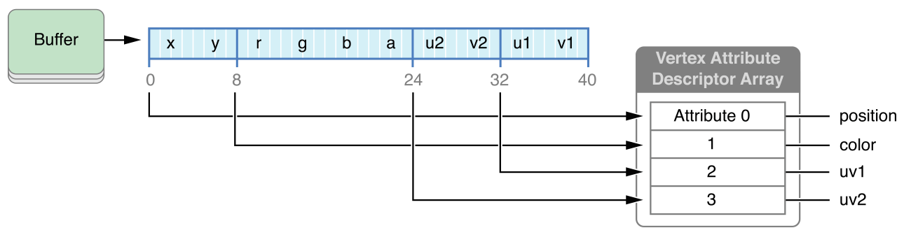 vertexDescriptorproperty to describe the organization of the vertex data in that argument, as described in Vertex Descriptor for Data Organization.The default value of