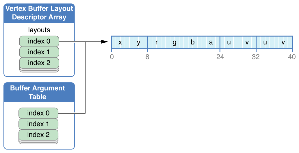 atIndexinput value of thesetVertexBuffer:offset:atIndex:method corresponds to the attributebuffer(atIndex)in the source code of the vertex function.Create a