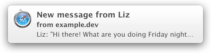 body—The notification’s subtitle.tag—The notification’s unique identifier. This tag prevents duplicate entries from appearing in Notification Center if the user has multiple instances of your website open.