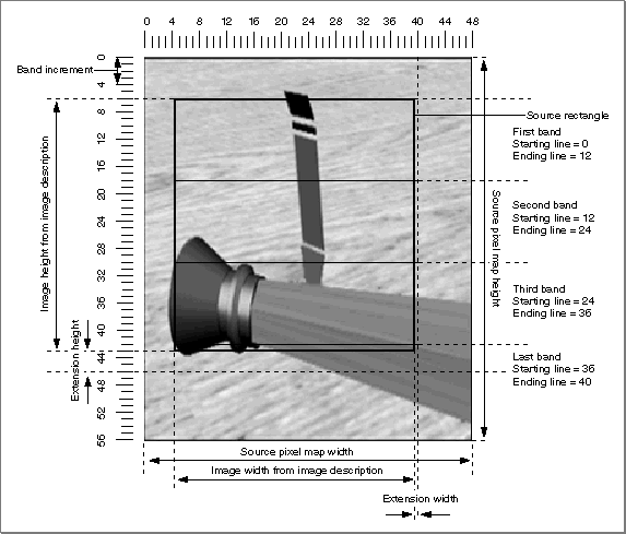 The width of the band is usually the width of the image, but the compressor can extend the measurement if it cannot easily handle partial blocks of pixels at the edge of the image. For compression operations, the Image Compression Manager sets the extra pixels added to the right edge of the band to the same value as the last pixel in each scan line. For decompression operations, the Image Compression Manager ignores the pixels that were added to the right edge for the extension.