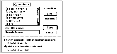 Your application may allow the user to decide how to save the movie. In this case, you can use a Save As dialog box similar to the one shown in Figure 2-1. In this dialog box, the user can elect to create a movie file that contains all of the data for a movie by clicking the “Make movie self-contained” radio button.