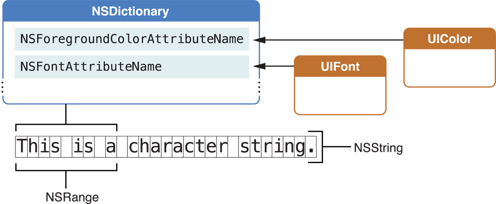 An attributed string stores character attributes as key-value pairs in NSDictionary objects. The key is an attribute name, represented by an identifier (an NSString constant) such as NSFontAttributeName. Figure 8-3 shows an attributed string with an attribute dictionary applied to a range within the string.