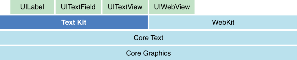 The UIKit framework includes several classes whose purpose is to display text in an app’s user interface: UITextView, UITextField, and UILabel, as described in Displaying Text Content in iOS. Text views, created from the UITextView class, are meant to display large amounts of text. Underlying UITextView is a powerful layout engine called Text Kit. If you need to customize the layout process or you need to intervene in that behavior, you can use Text Kit. For smaller amounts of text and special needs requiring custom solutions, you can use alternative, lower-level technologies, as described in Lower Level Text-Handling Technologies.