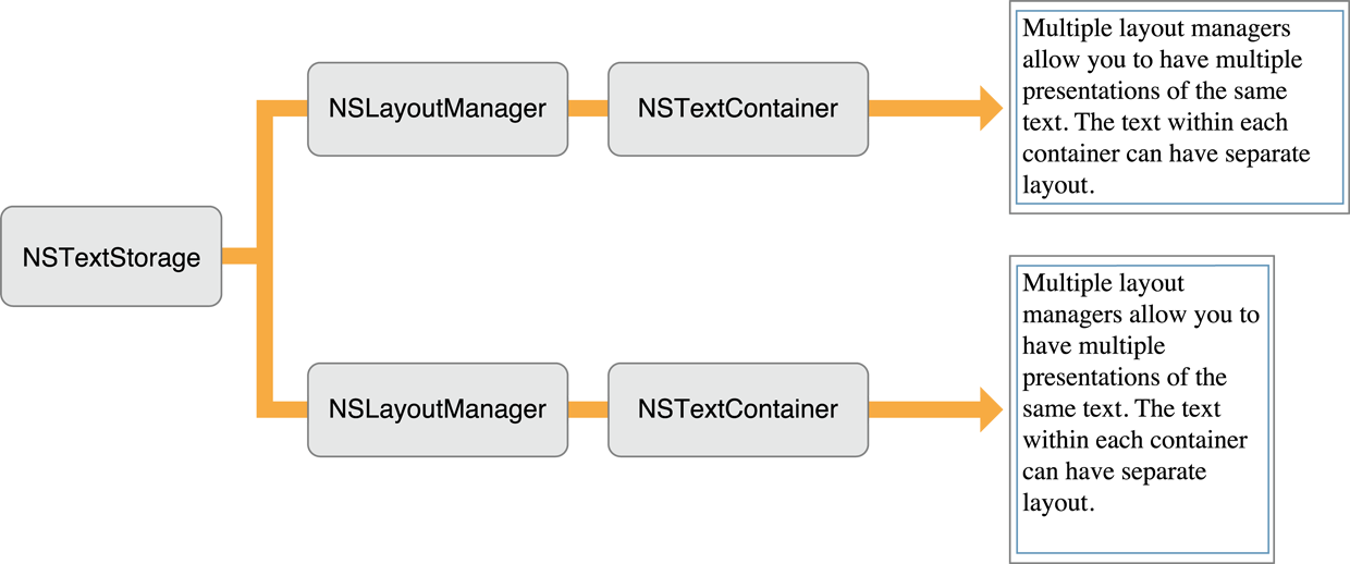 Not only can you have multiple text containers, you can also have multiple NSLayoutManager objects accessing the same text storage. Figure 8-9 illustrates an object arrangement with multiple layout managers. The effect of this arrangement is to provide multiple views of the same text. If the user alters the text in the top view, the change is immediately reflected in the bottom view (assuming the location of the change is within the bottom view’s bounds).