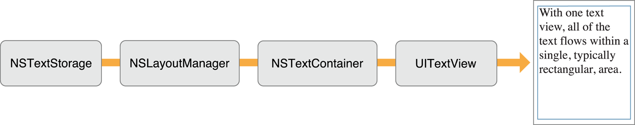 In the simplest case, the Text Kit objects are configured singly, that is, one text storage object, one text container, and one layout manager, as shown in Figure 8-6. This configuration is instantiated automatically when you drag a text view from the object library in Interface Builder. The UITextView object vends the other objects and connects them together. You can also create this arrangement in code, as shown in Listing 8-6.