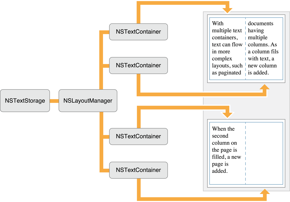 Instead of having one text container correspond to a single page, there are now two text containers—one for each column on the page. Each text container controls a portion of the document. As the text is displayed, glyphs are first laid out in the top-left container. When there is no more room in that view, the layout manager informs its delegate that it has finished filling the container. The delegate can check to see whether there’s more text that needs to be laid out and add another text container if necessary. The layout manager proceeds to lay out text in the next container, notifies the delegate when finished, and so on. Again, a custom view (depicted as a blue rectangle) provides a canvas for these text columns.