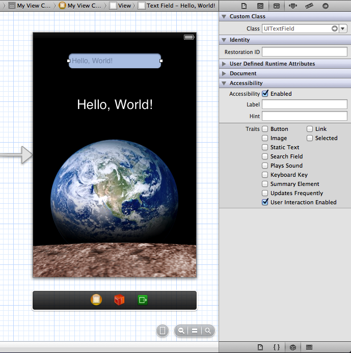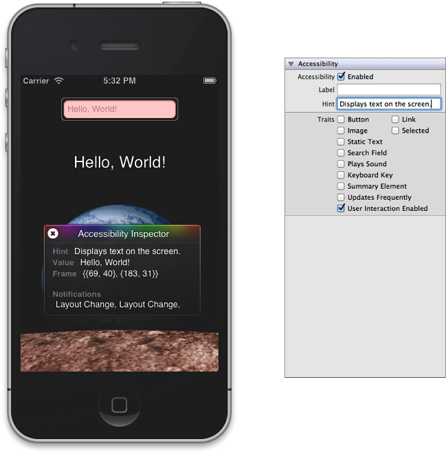 As you can see in Figure 2-1, the standard text field used in the nib file is accessible by default and includes default information for the label, hint, and traits attributes. (Note that, for a text field that displays placeholder text, the default label is the placeholder text.) You can change any of these default values by supplying new information in the Identify inspector, as shown in Figure 2-2. (Figure 2-2 also shows how Accessibility Inspector displays the accessibility information for the text field. See Debug Accessibility in iOS Simulator with the Accessibility Inspector to learn about Accessibility Inspector.)