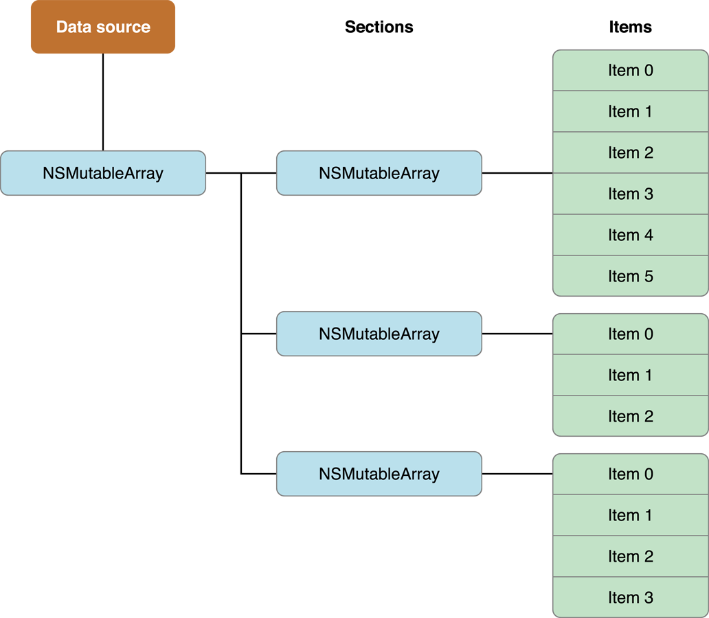 An efficient data source uses sections and items to help organize its underlying data objects. Organizing your data into sections and items makes it much easier to implement your data source methods later. And because your data source methods are called frequently, you want to make sure that your implementations of those methods are able to retrieve data as quickly as possible.