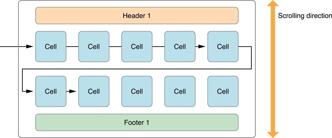You can arrange items in your collection views using a concrete layout object, the UICollectionViewFlowLayout class. The flow layout implements a line-based breaking layout, which means that the layout object places cells on a linear path and fits as many cells along that line as it can. When the layout object runs out of room on the current line, it creates a new line and continues the layout process there. Figure 3-1 shows what this looks like for a flow layout that scrolls vertically. In this case, lines are laid out horizontally with each new line positioned below the previous line. The cells in a single section can be optionally surrounded with section header and section footer views.