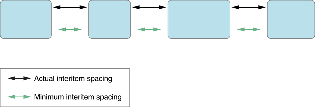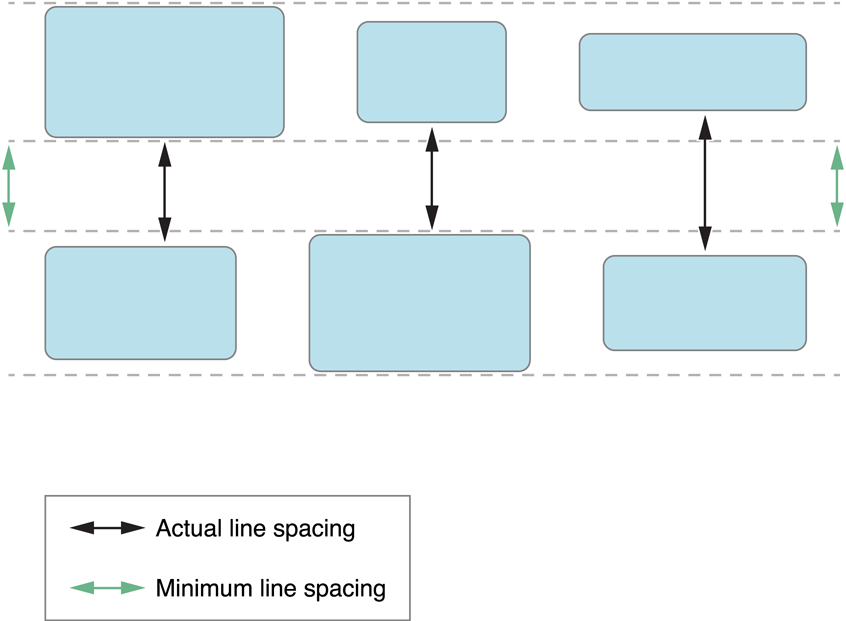 Figure 3-4 demonstrates what happens with the minimum line spacing when items are of different sizes. With differently sized items, the flow layout object picks the item from each line whose dimension in the scrolling direction is the largest. For example, in a vertically scrolling layout, it looks for the item in each line with the greatest height. It then sets the spacing between those items to the minimum value. If the items are on different parts of the line, as shown in the figure, the actual line spacing appears to be greater than the minimum.