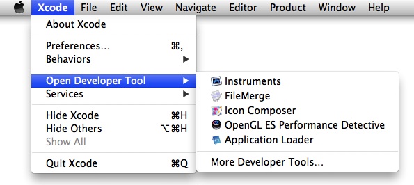 Other standalone utility applications and add-on technologies. Several additional tools are no longer part of the default Xcode installation, they are now downloadable as separate packages. The More Developer Tools menu command (Figure 5) provides a direct jump to developer.apple.com/downloads in Safari where these development tools can be found.