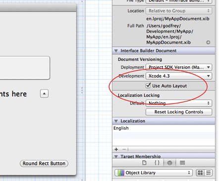 New Cocoa projects created in Xcode 4.3 now use Interface Builder’s Auto Layout feature by default. It can be disabled by deselecting an option in the Interface Builder design canvas (Figure 6):
